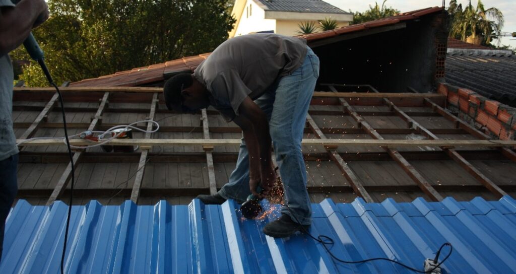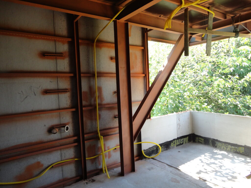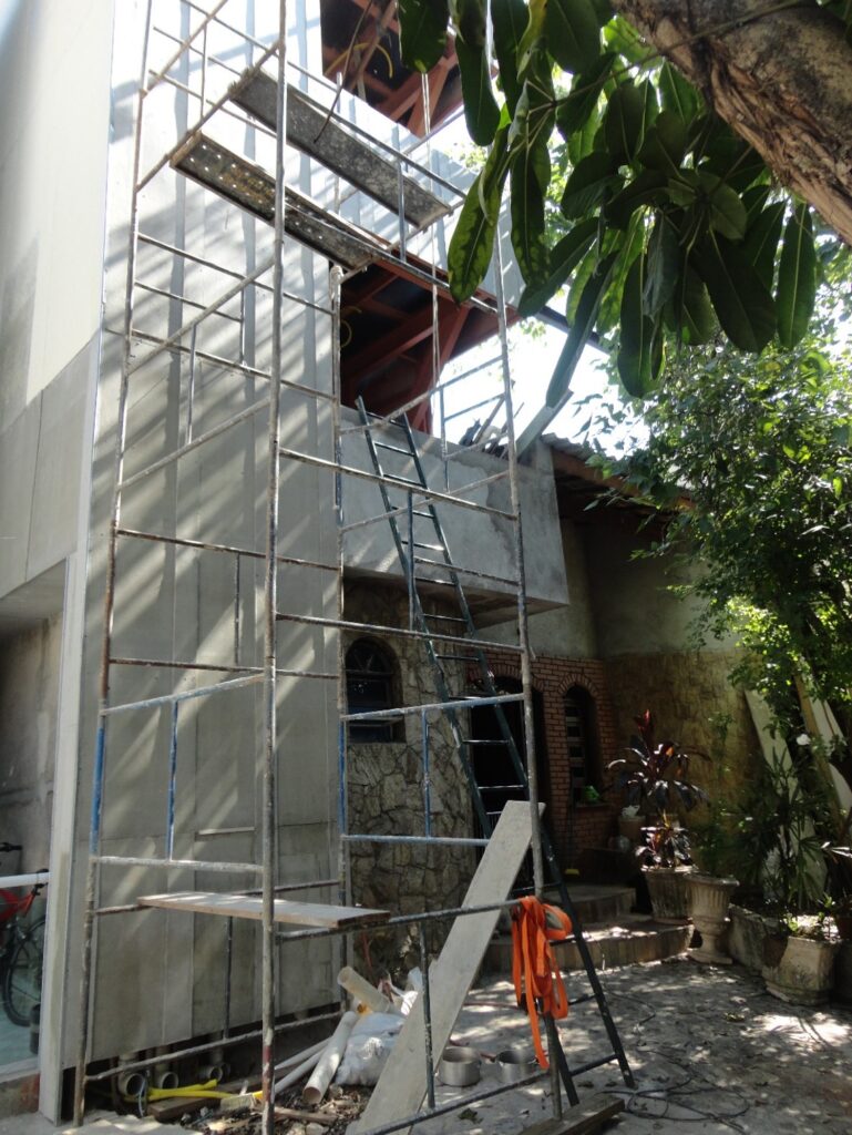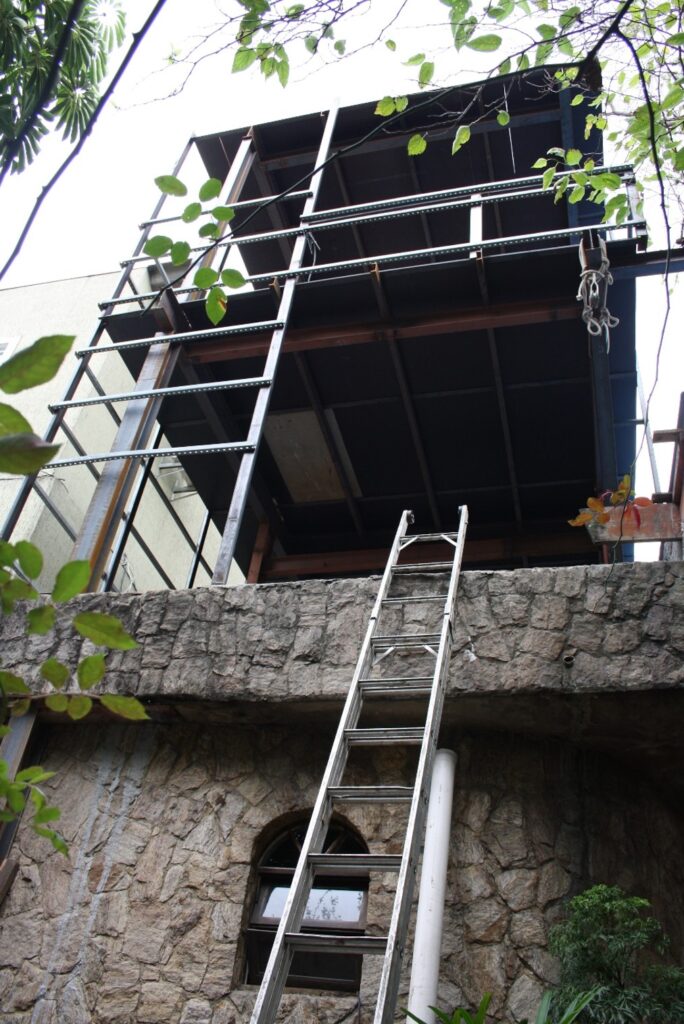 Com um cronograma de obras apertado e a família morando na casa durante a obra, a solução escolhida foi fazer a ampliação utilizando estrutura metálica e steel deck com fechamento externo em placas cimentícias e interno em dry wall de gesso.